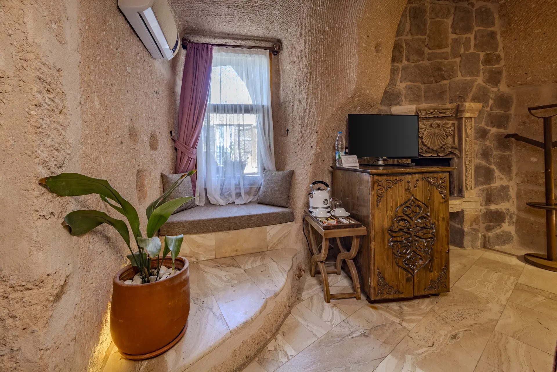 В пропитанной историей атмосфере отеля Eyes of Cappadocia наш Антикварный пещерный номер площадью 65 м² выделяется своей просторностью, предлагая вам вневременной опыт проживания. Этот особенный номер, высеченный в тысячелетних скальных образованиях, создает одновременно аутентичную и просторную атмосферу для двух взрослых. Это пространство, где вы почувствуете мистический дух Каппадокии в каждой детали, становится незабываемым убежищем, сочетая историческую текстуру с современной роскошью.